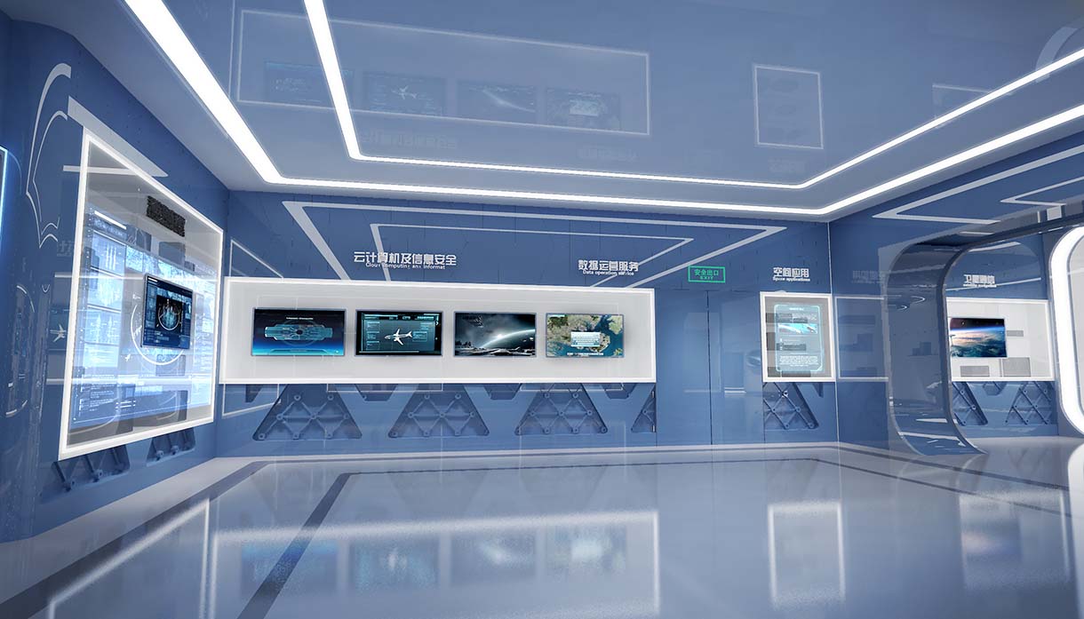 展廳設計策劃思路:以航天五院503所企業文化、產品特性、服務范圍作為設計出發點,以航空,衛星軌跡造型為基礎,提煉其中創意進行轉化,結合展廳“航天之星,窺探蒼穹”的主題。體現展廳科技感,現代感的設計效果。