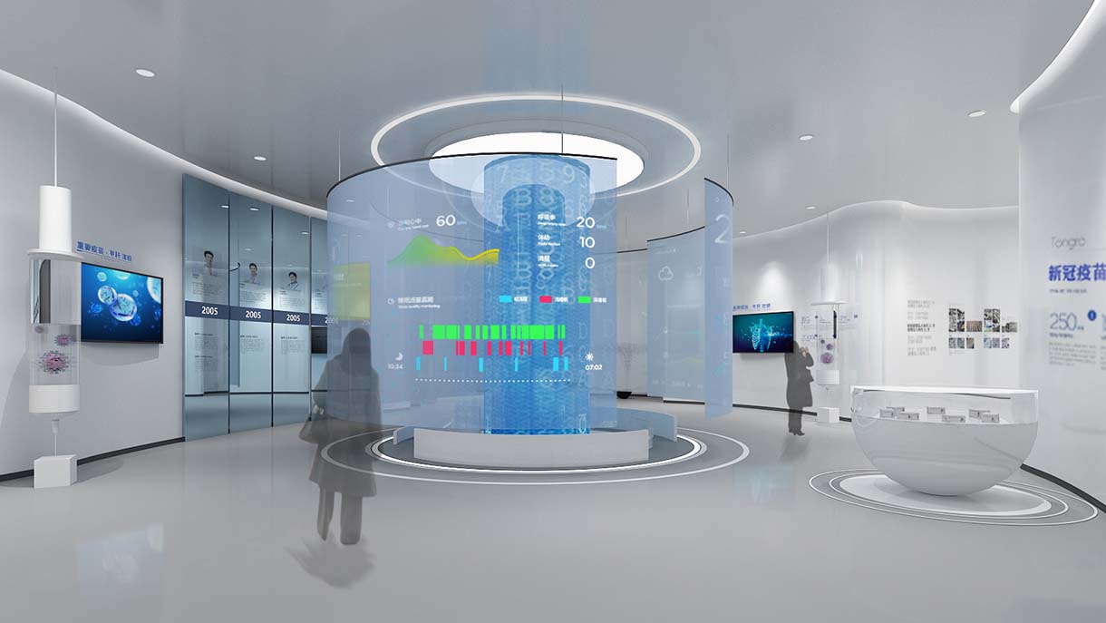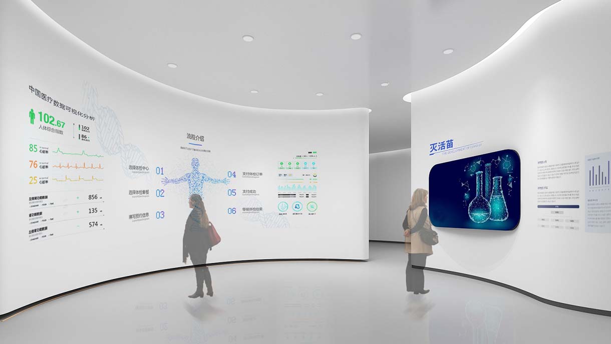 智慧醫(yī)療展廳設(shè)計一定要將“智慧”的主題貫穿在整體的展示過程中,在展示空間中運用互動滑軌屏突出智慧醫(yī)療主線,能使參觀者處處感受到智能化現(xiàn)代化科技感的信息。
