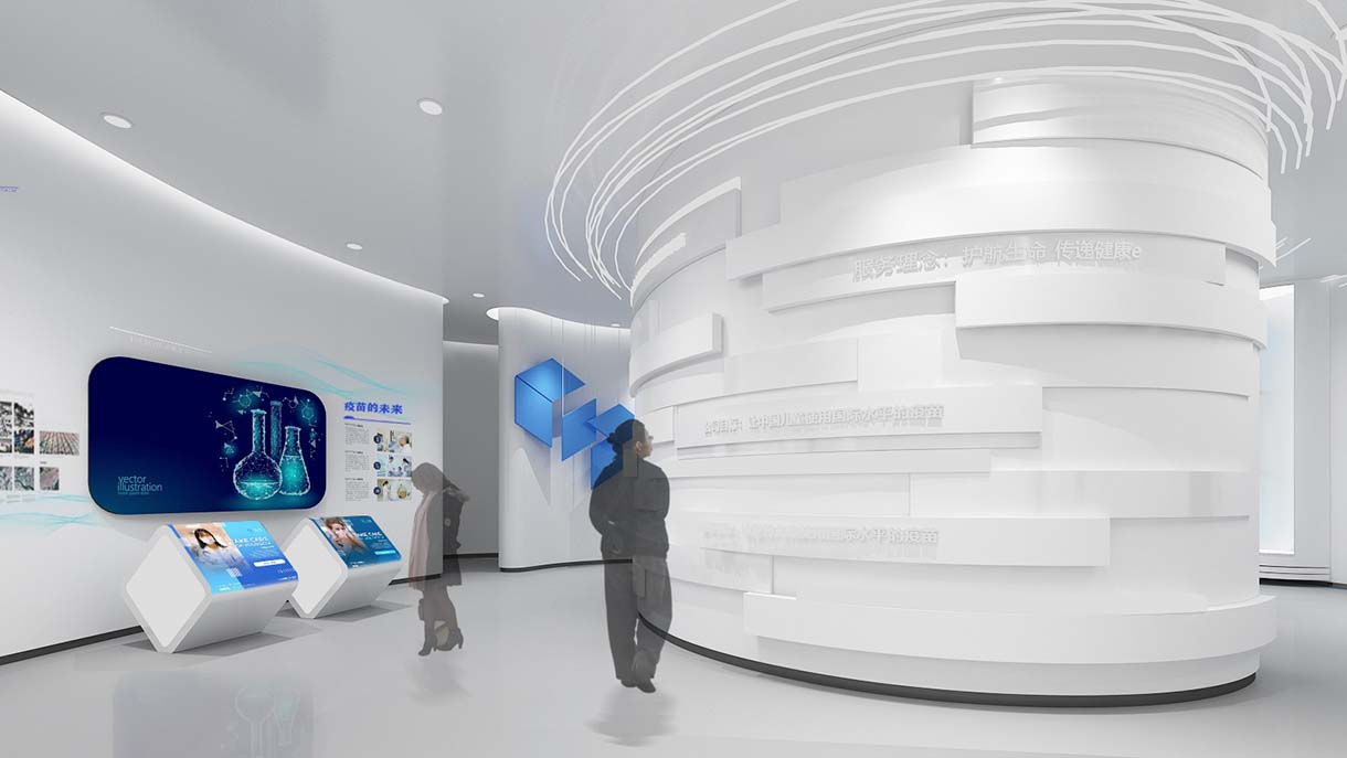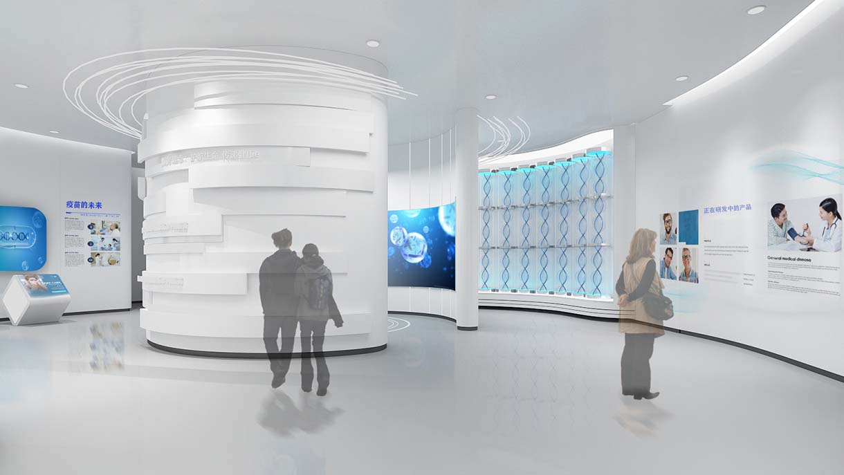 展廳設(shè)計策劃思路:在前期設(shè)計策劃時遵循北京科興生物的核心理念“為人類消除疾病提供疫苗”,從服務(wù)人類的原點出發(fā),以智慧醫(yī)療白作為整體的設(shè)計調(diào)性,生物基因作為輔助元素,打造了一個親近人類的藝術(shù)空間。