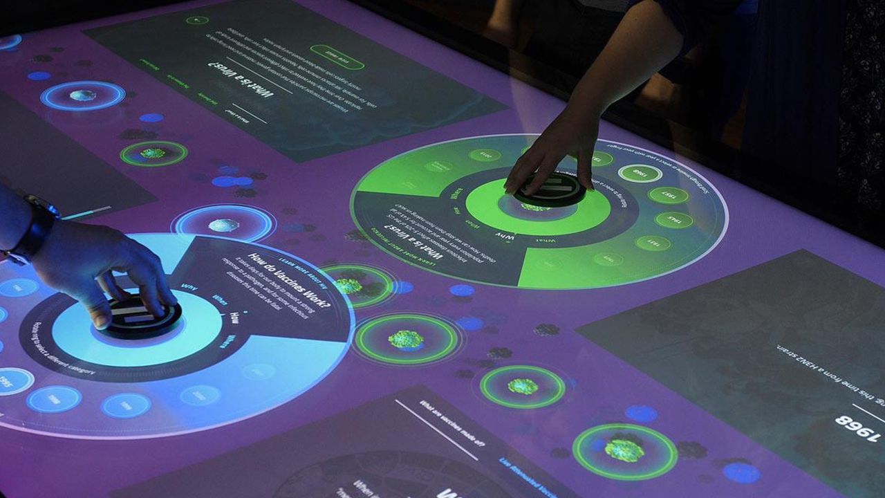 物體識別桌即在一體機桌面顯示屏上放置一個實物,顯示屏即可顯示出物體的基本信息。體驗者可以再進一步進行點擊,對介紹圖片和視頻進行縮放、平移、旋轉等操作。